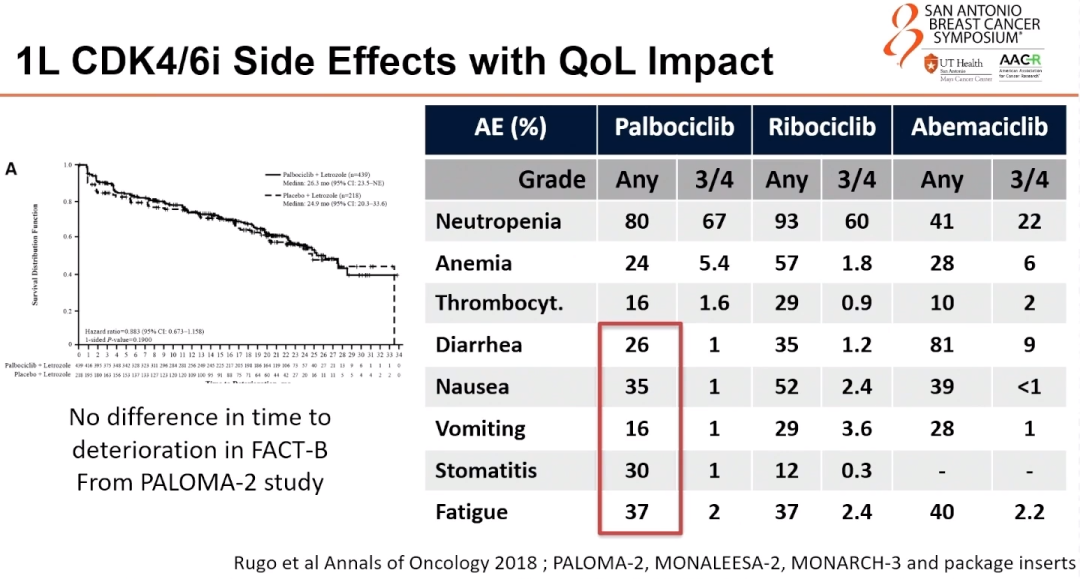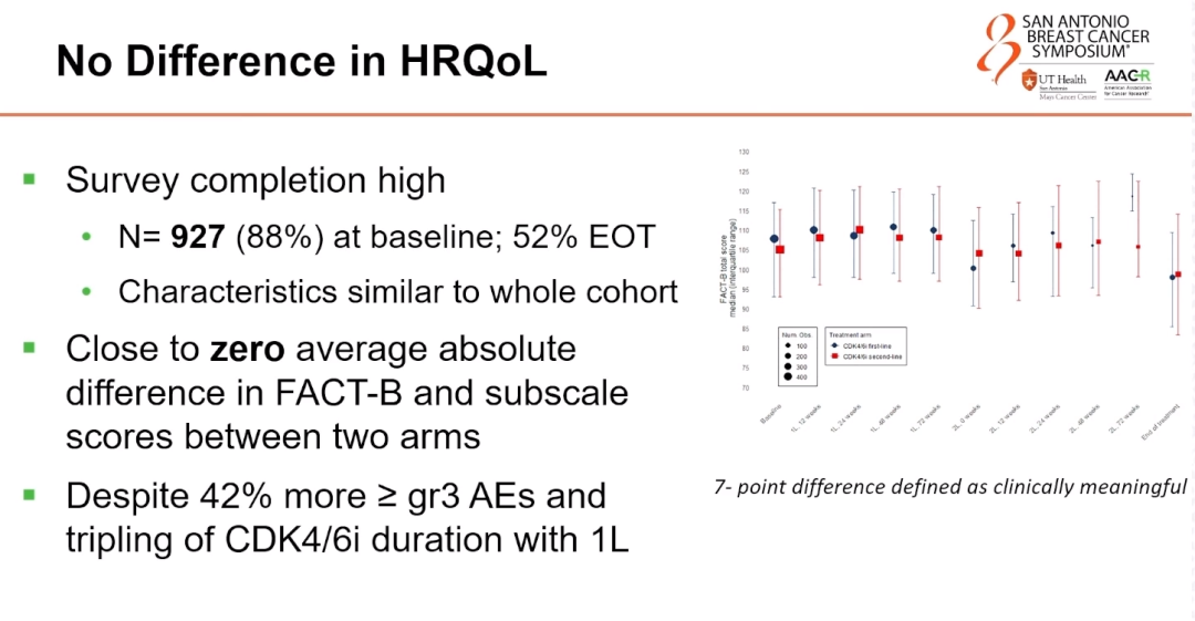 在SONIA试验中,根据协议定义的两线治疗期间,通过FACT-B总分和所有子量表测量的健康相关生活质量在CDK4/6i一线和二线组间相当。这些数据表明,与二线相比,在一线加入CDK4/6i并不会提高HRQoL,这为将CDK4/6i的使用推迟至二线治疗提供了进一步的理由。