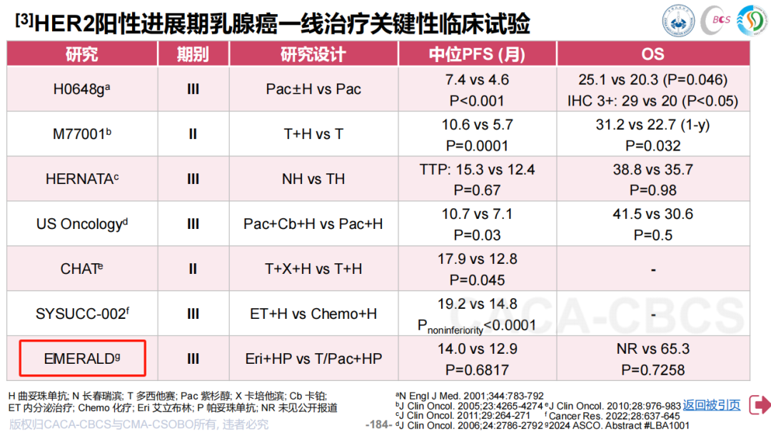 此外,对于HER2阳性晚期乳腺癌患者的治疗,基于EMERALD临床研究结果,一线化疗方案中增加了含艾立布林的方案。由此可见,在临床治疗中有很多新药涌现,并增加了患者的治疗机会。