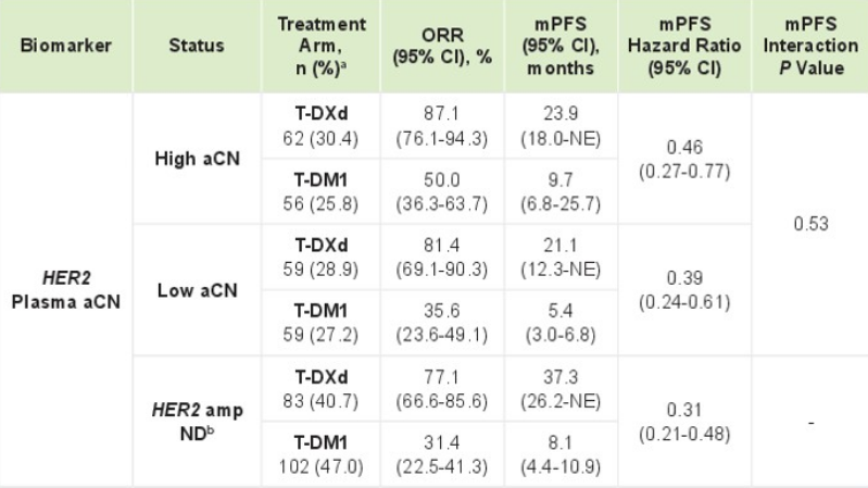 这次SABCS大会首次公布了DB-03研究的生物标志物分析[4],我们需要从两个角度去分析。首先是不同基因组变异的亚组患者中,T-DXd对比T-DM1的疗效获益是否有差别?研究结果显示,总体上无论PI3K-AKT-mTOR(PAM)通路是否变异、HER2扩增拷贝高或低、是否存在同源重组修复缺陷(HRD),T-DXd组的ORR和PFS均优于T-DM1组。