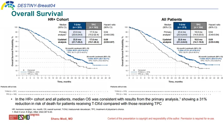 2023年ESMO发布了该研究中位随访32个月的OS结果,显示在总人群中T-DXd和TPC组的mOS分别22.9个月和16.8个月;在激素受体阳性(HR+)人群中的mOS则分别为23.9个月和17.6个月(图1)[1]。