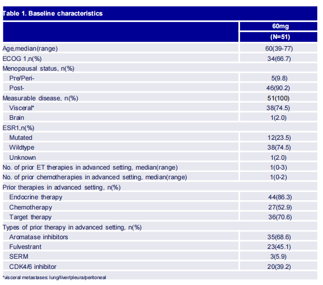 截至2024年6月17日,共有51例患者入组并接受了治疗。患者中位年龄为60岁,90.2%为绝经后女性。基线时,23.5%的患者检测到ESR1突变,74.5%的患者有内脏转移(肝35.3%,肺54.9%)。患者既往在晚期阶段中接受过中位1线化疗和1线内分泌治疗;45.1%的患者既往接受过氟维司群治疗,39.2%的患者既往接受过CDK4/6抑制剂治疗(Table 1)。研究的关键终点包括安全性、耐受性和疗效。
