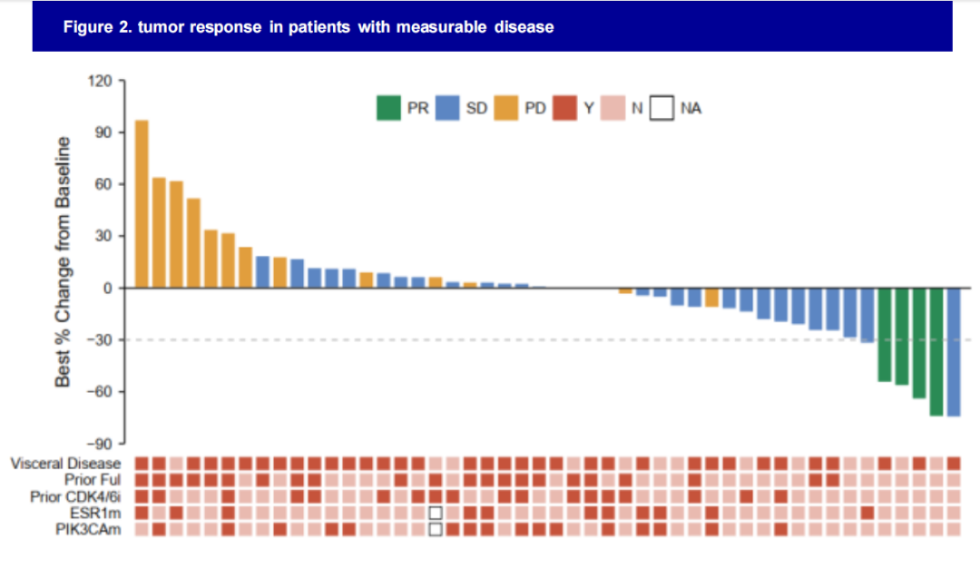 确认的客观缓解率(ORR)为8.3%(Figure 2),24周时的临床获益率(CBR)为37.8%,ESR1突变患者的CBR为40.0%,ESR1野生型患者的CBR为38.2%。