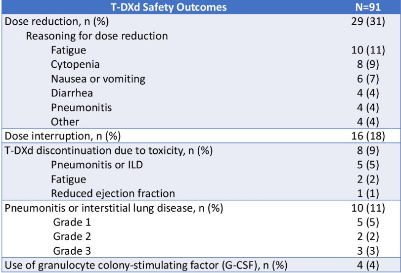 该研究共纳入91名患者,中位年龄为61岁(33~84岁)。72名患者(79%)为HR阳性,19名患者(21%)为HR阴性。76%患者的HER2免疫组织化学(IHC)表达为1+,24%患者为2+[PS1]/ISH-。91%的患者有内脏转移,4.4%的患者为单纯骨转移。T-DXd治疗开始前,既往接受0线、1线、2线及≥3线细胞毒性化疗药物的患者分别占11%、42%、24%和23%。11%的患者既往接受过SG(戈沙妥珠单抗)治疗。