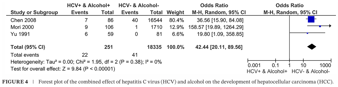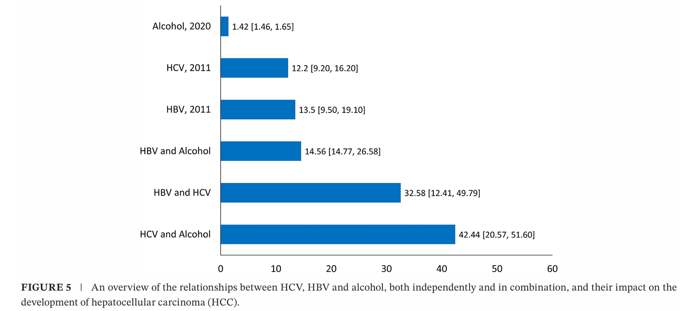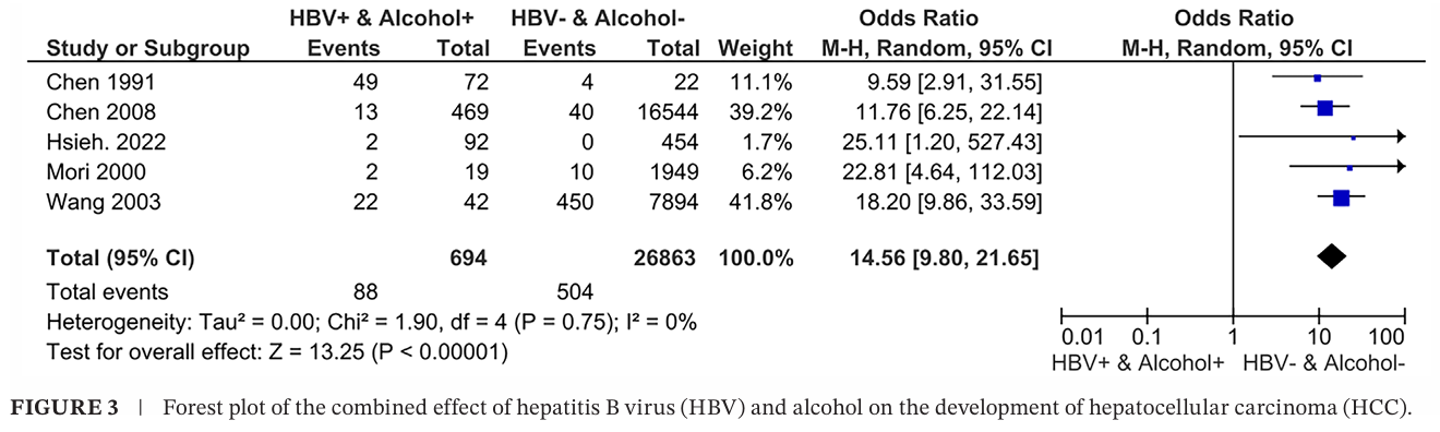 这项荟萃分析表明了HBV、HCV和饮酒等因素对HCC风险的综合影响。其中,HBV和HCV共同感染可显著增加HCC发展风险,超过32倍(OR=32.58);在HBV或HCV存在的情况下,饮酒会显著增加HCC发展风险,分别超过14倍(OR=14.56)和42倍(OR=42.44)。