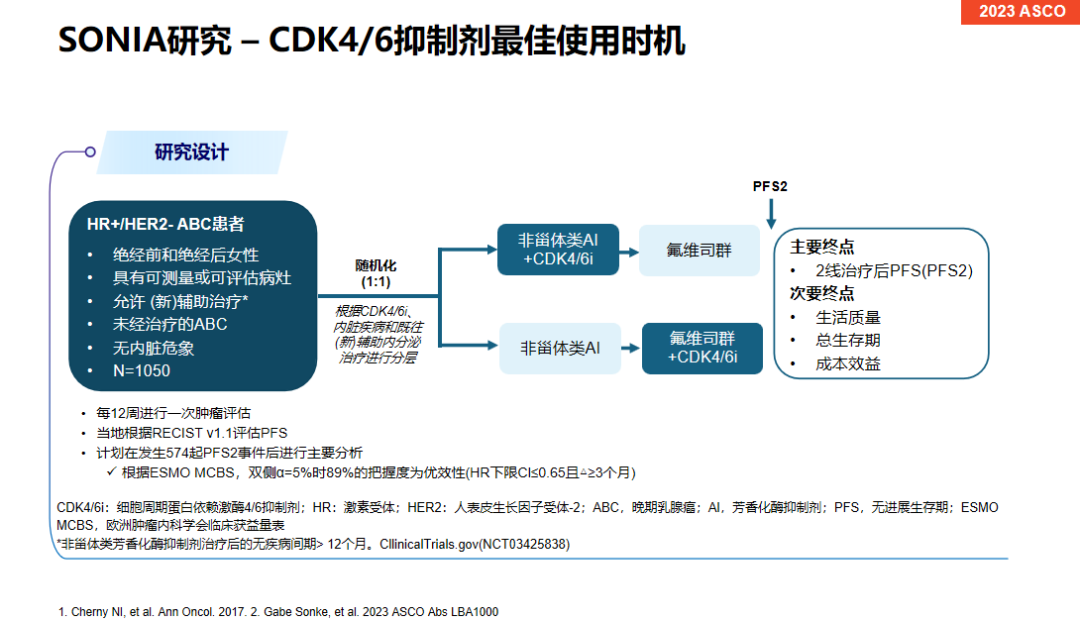 陈占红教授:这是一个非常值得探讨的问题。当前,CDK4/6抑制剂加内分泌治疗(ET)已成为晚期HR+乳腺癌患者一线治疗的首选。大家一直在思考,究竟是在一线治疗时就立即使用CDK4/6抑制剂,还是等到内分泌治疗出现进展后再加用CDK4/6抑制剂,哪种方式更经济、疗效更好?SONIA临床研究确实给出了阴性的结果,即一线和二线治疗相比使用CDK4/6抑制剂在无进展生存期(PFS)和总生存期(OS)上都没有显著性统计学差异。