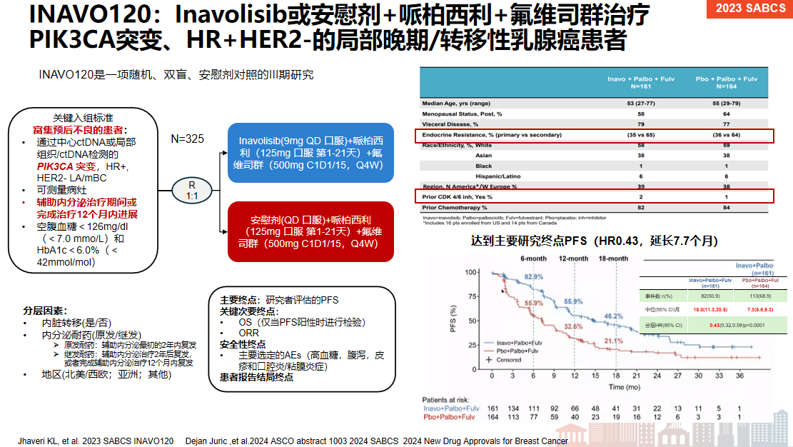 陈占红教授:事实上,分层治疗的重要性大于分线治疗,因为我们在整个治疗过程中都会根据精准治疗的诊断来选择治疗方案。我们会考虑患者是否存在PAM通路的激活突变、ESR1突变、BRCA突变等。对于某些特殊患者,比如在辅助治疗或辅助内分泌治疗停药一年之内就复发转移,并且有PI3K突变的患者,我们可能会采用二线治疗的方案,尽管他们理论上应该接受一线治疗。INAVO 120研究为我们提供了很好的答案,在这类患者中,我们用CDK4/6i+ET+Inavolisib治疗相较于既往用CDK4/6抑制剂+ET治疗效果好很多。中位随访21.3个月时,Inavolisib组的中位PFS显著长于安慰剂组(15.0个月vs.7.3个月,HR=0.43)。