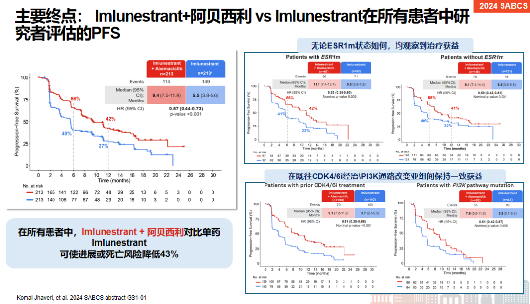 此外,2024年SABCS大会上公布的EMBER-3临床研究结果也证实了ESR1突变的患者,应用口服SERD药物(Imlunestrant)也能取得较好的治疗效果。Imlunestrant+阿贝西利甚至能达到11.1个月的PFS。由此可见,对于ESR1突变的患者,口服SERD±CDK4/6抑制剂都是较好的治疗选择。