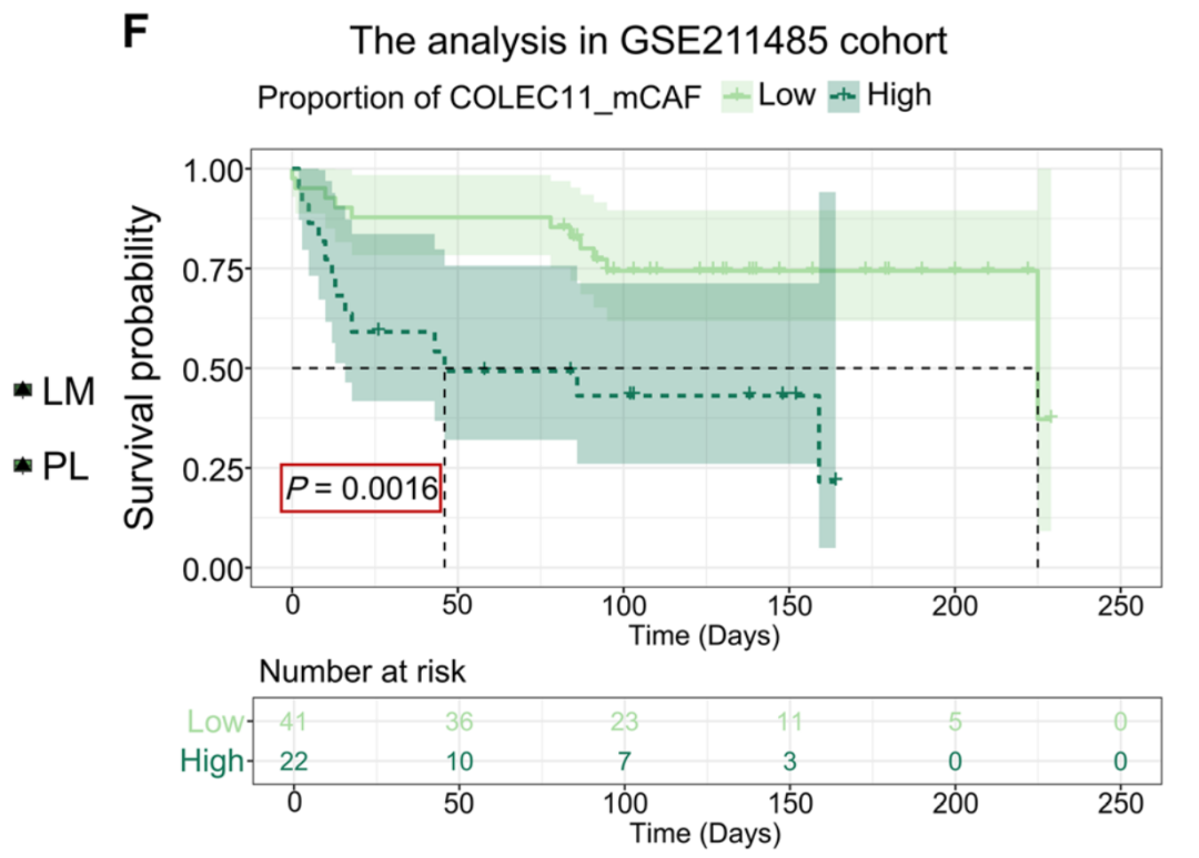 △COLEC11_mCAFs高或低比例患者的总生存K-M曲线