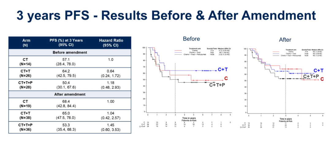 在本研究中,单独使用曲妥珠单抗在MPR和PFS方面较单纯化疗表现出了显著获益,3年PFS率的风险比为0.85。其中,在化疗方案修改前接受治疗的患者优势更为显著(HR:0.64)。在化疗方案修改后,这种优势变得不再明显(HR:1.04)。对于3年总生存率,风险比为0.89,其中方案修改前为0.77,修改后为0.99。