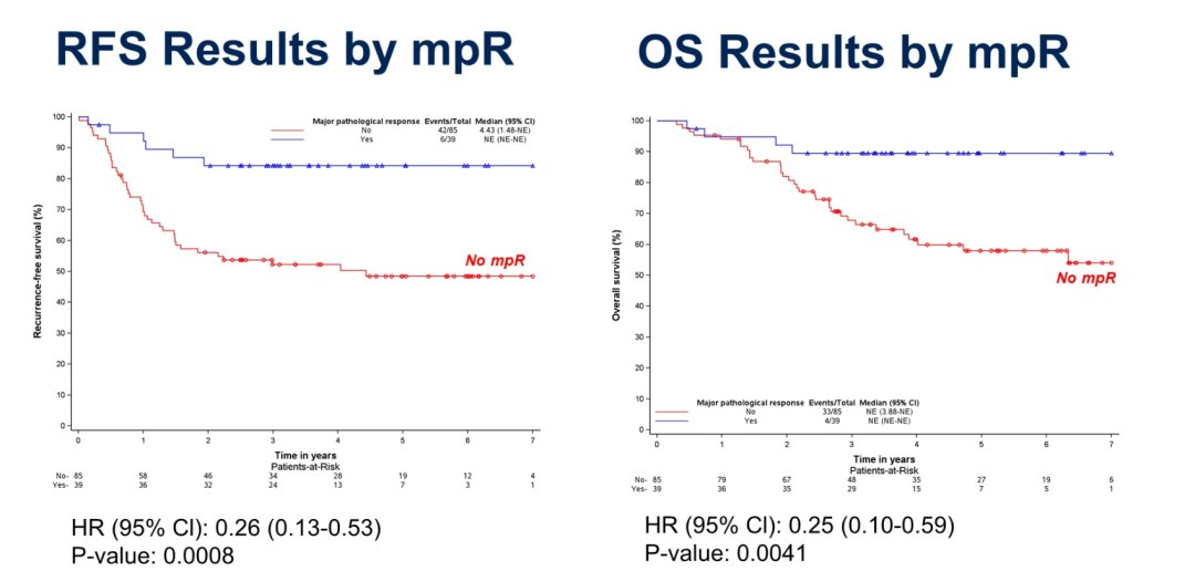 进一步分析发现,无复发生存期(RFS)与MPR呈强相关性。达到MPR的患者相较于未达到MPR患者,其RFS的风险比为0.26,OS的风险比为0.25,这一结果具有高度相关性。然而,由于样本量相对较小且研究提前终止,MPR的提高并未能转化为具有统计学意义的OS获益。