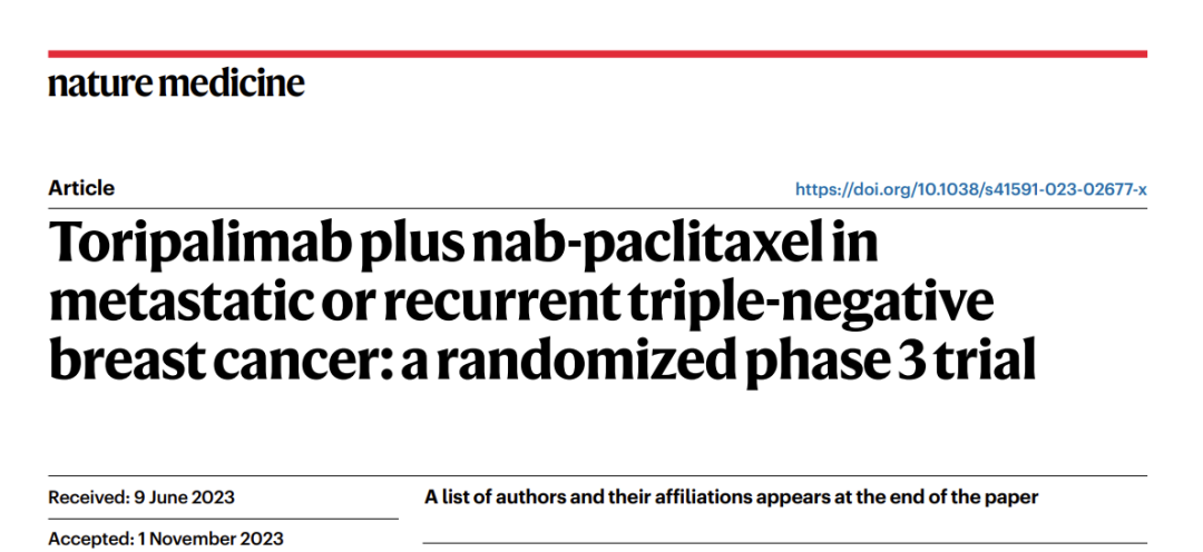 研究题目:Toripalimab plus nab-paclitaxel in metastatic or recurrent triple-negative breast cancer:a randomized phase 3 trial