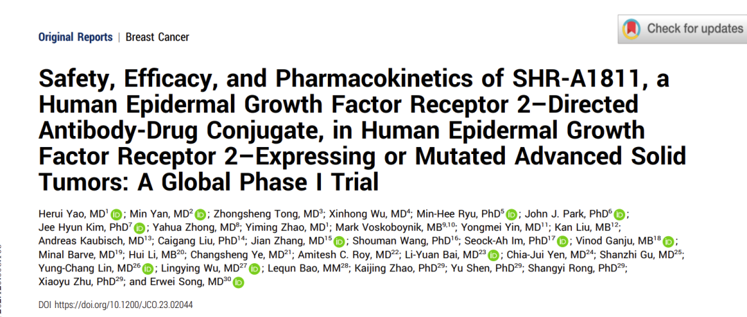 研究题目:Safety,Efficacy,and Pharmacokinetics of SHR-A1811,a Human Epidermal Growth Factor Receptor 2-Directed Antibody-Drug Conjugate,in Human Epidermal Growth Factor Receptor 2-Expressing or Mutated Advanced Solid Tumors:A Global Phase I Trial