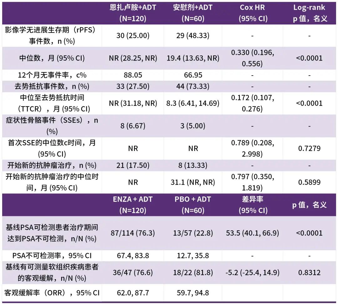 China ARCHES研究是一项针对初治mHSPC患者的III期临床研究。该研究将接受ADT联合恩扎卢胺治疗的患者试验组,而传统的单药ADT疗法作为对照组。研究结果显示在ADT联合恩扎卢胺能够显著延长疾病的控制时间,包括使PSA进展风险显著降低87%(HR 0.130,95%CI:0.076-0.222,P<0.0001),使影像学疾病进展或死亡风险显著降低67%(HR 0.330,95%CI:0.196-0.556,P<0.0001)等[5]