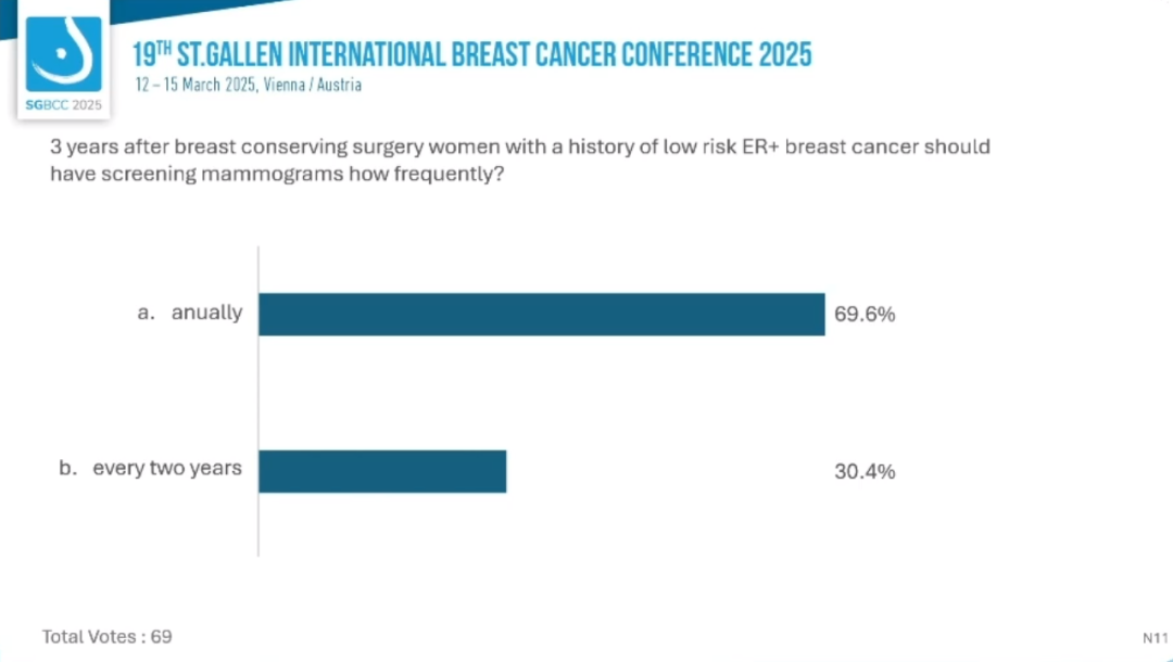 编者按:第19届St.Gallen国际乳腺癌大会(SGBCC 2025)于当地时间2025年3月12~15日在音乐之都维也纳举行。大会的最后一天,专家投票压轴登场。《肿瘤瞭望》整理了导管原位癌、幸存者治疗的专家投票,现整理给大家,与大家一起感受早期乳腺癌治疗决策的圣加伦氛围。