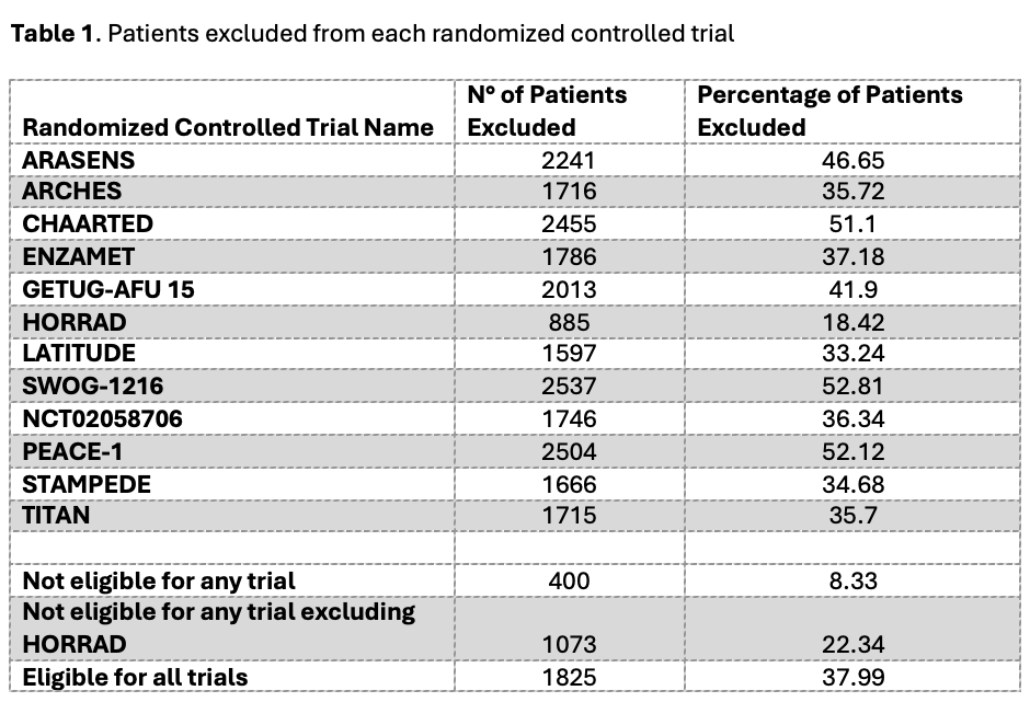 研究结论:尽管RCT提供了最高级别的证据,但其普适性受到严格的排除标准限制,导致其研究结果基于有限且经过严格筛选的转移性前列腺癌患者群体。在根据RCT研究结果推荐治疗方法时,应考虑到这一限制。未来的RCT应采用限制性较低的标准,并纳入更具异质性和代表性的患者群体。