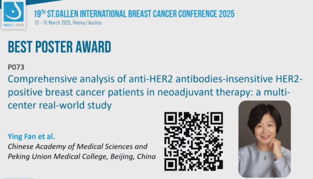 编者按:备受瞩目的第19届St.Gallen早期乳腺癌研讨会(SGBCC)于当地时间2025年3月12日至15日在世界音乐之都奥地利维也纳举行。本次SGBCC大会共评选出7项研究授予“最佳壁报奖(Best poster award)”。令人骄傲的是,其中有4项研究成果来自中国,包括中国医学科学院肿瘤医院樊英教授汇报的“Comprehensive analysis of anti-HER2 antibodies-insensitive HER2-positive breast cancer patients in neoadjuvant therapy:a multi-center real-world study(新辅助治疗中对HER2靶向治疗不敏感的HER2阳性乳腺癌患者的综合分析:一项多中心真实世界研究)”。《肿瘤瞭望》有幸邀请樊英教授进一步分享其团队的研究成果和实践经验。