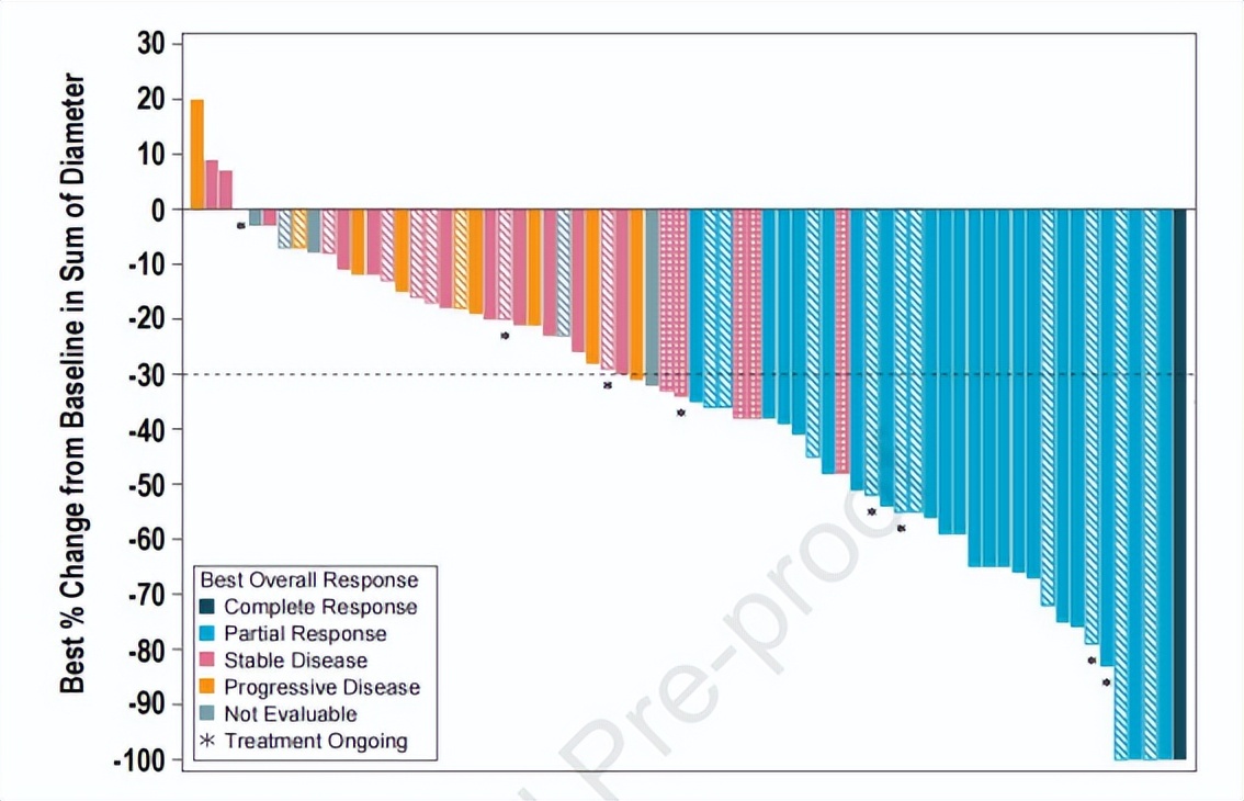 研究共纳入105例患者,51%的患者为非小细胞肺癌,55%的患者携带HER-2突突变,17%携带HER-2重排,中位治疗线数为4线。2例患者出现剂量限制性毒性,分别是在240mg,口服,每日一次剂量组出现一例3度腹泻和360mg,口服,每日一次剂量组出现一例3度血小板数量下降。3度以上治疗相关不良反应发生率为10%,包括谷丙转氨酶升高4%,谷草转氨酶升高2%,皮疹2%。严重不良反应发生率为37%。ORR和DCR分别为30%和83%。中位DOR为12.7个月,中位PFS为8.0个月。在非小细胞肺癌患者中,ORR和DCR分别为35%和93%,中位DOR未达到,中位PFS为8.7个月。