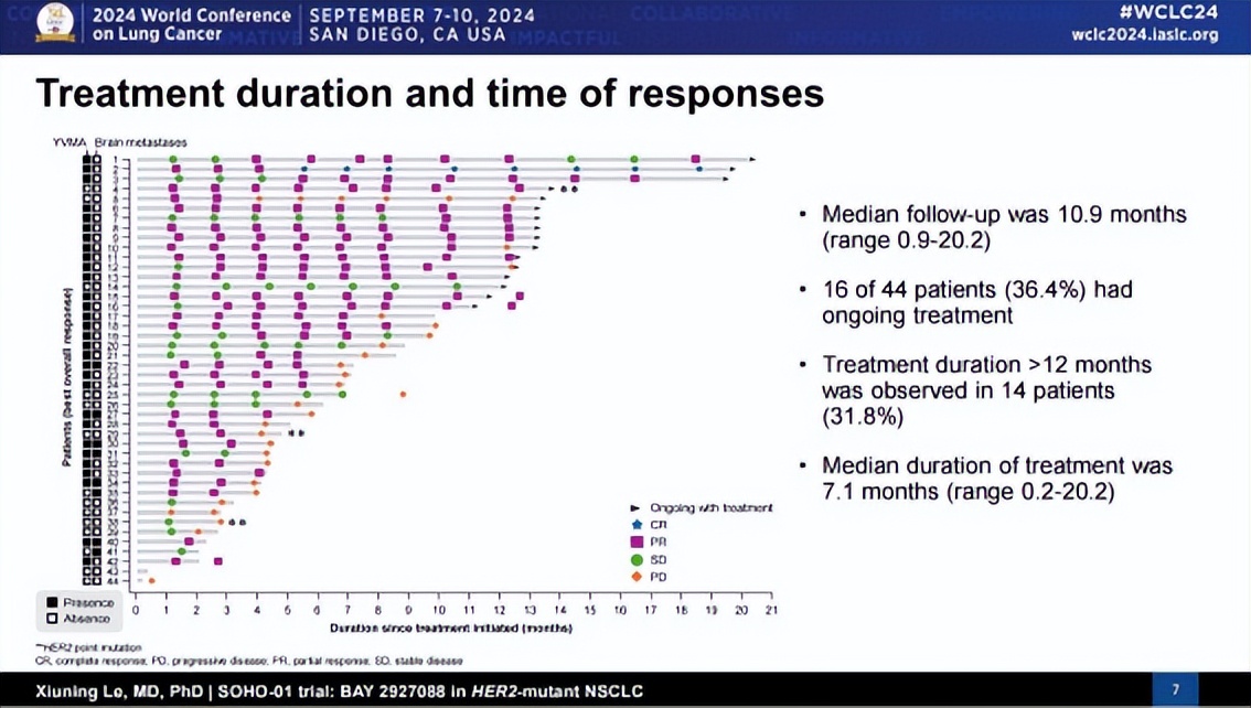2、BAY2927088:同样于2024年世界大会公布了该药针对HER-2突变的1/2期临床研究数据(SOHO-01研究)。基于前期给药数据,该药物的II期推荐给药剂量为20mg,口服,每日两次。本次世界肺癌大会公布了携带HER-2插入突变且未接受靶向药物治疗的患者数据。该队列共入组44例患者,18.2%的患者有脑转移,全组患者ORR为72.1%,中位PFS为7.5个月,3度以上不良反应发生率43.2%。
