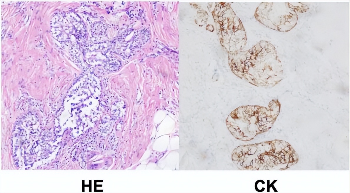 诊断:左乳浸润性导管癌(三阴型,cT2N1MO,IIB期)。