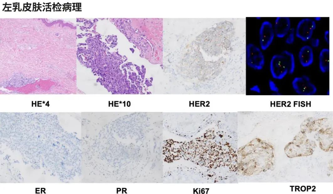 皮肤活检,病理:表皮大致正常。真皮浅、中、深层血管、淋巴管内见肿瘤细胞团块,胞核深染,胞浆丰富,部分呈空泡状。符合皮肤转移癌(乳腺来源可能)。免疫组化:ER(-),PR(-),HER-2浸润癌(2+),Ki-67约80%(+),TROP2(约50%中-强+、约20%弱+);GATA-3(+),TRPS1(+)。Fish阴性