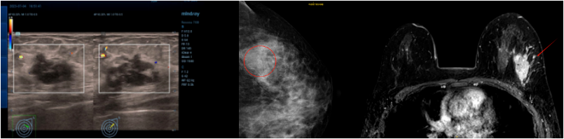 乳腺钼靶:左乳外上象限钙化灶及结节影,BI-RADS 4B类。