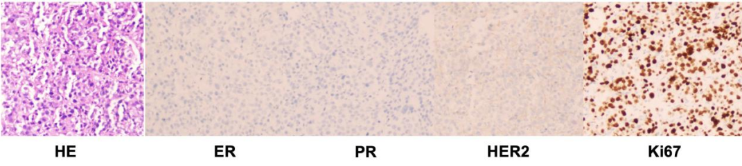 右腋窝淋巴结穿刺病理:见癌转移。IHC:ER<1%(+)、PR<1%(+)、HER-2(1+)、Ki-67热点区域约85%(+)。