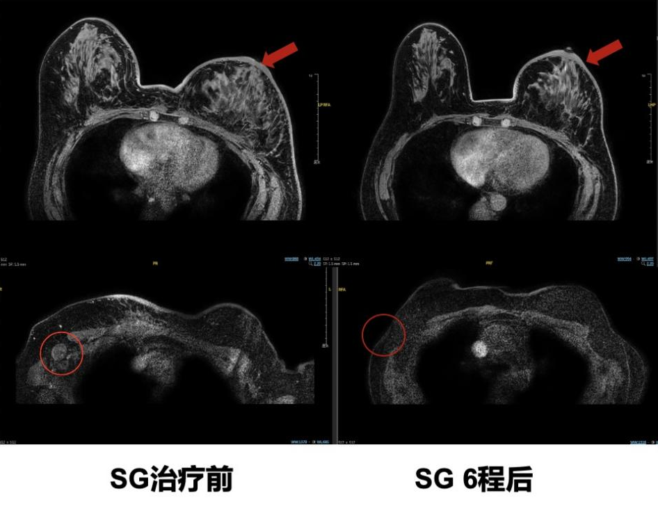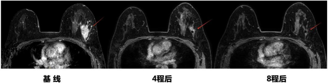 6程后复查乳腺MR、胸部+上腹部CT、乳腺彩超,提示:左乳病灶范围较前明显缩小,右腋窝肿大淋巴结消失。