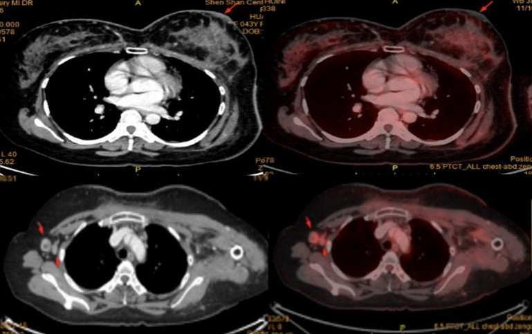 PET-CT:考虑左乳皮皮肤转移伴炎症可能;右侧腋窝淋巴结转移。余未见明显异常。
