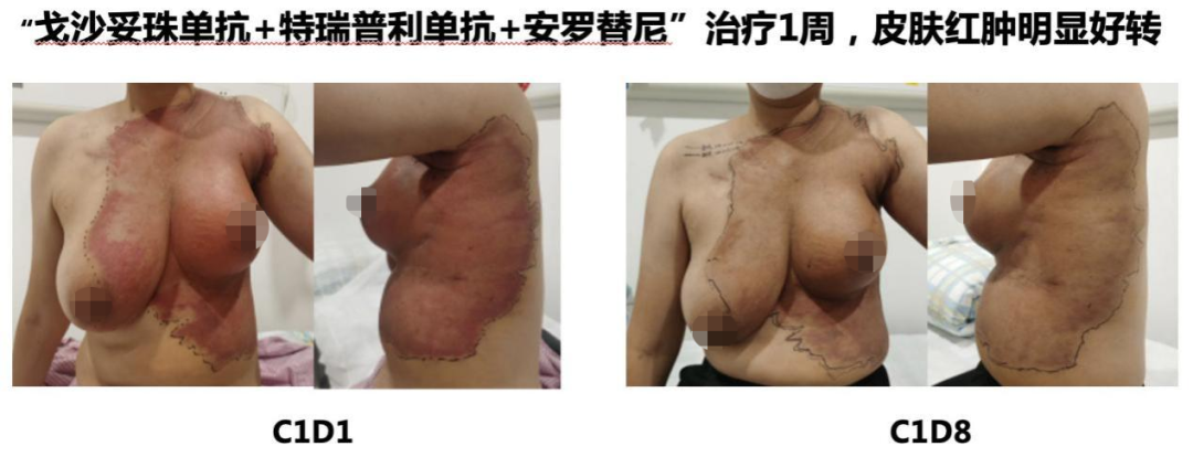 本例患者在mTNBC一线使用戈沙妥珠单抗联合了特瑞普利单抗和安罗替尼的联合治疗,显示出了惊人的疗效,治疗1周,乳腺、腹部、背部红肿明显改善,4个疗程后皮肤转移瘤完全缓解,目前患者仍在接受治疗随访中,期待进一步疗效评估。