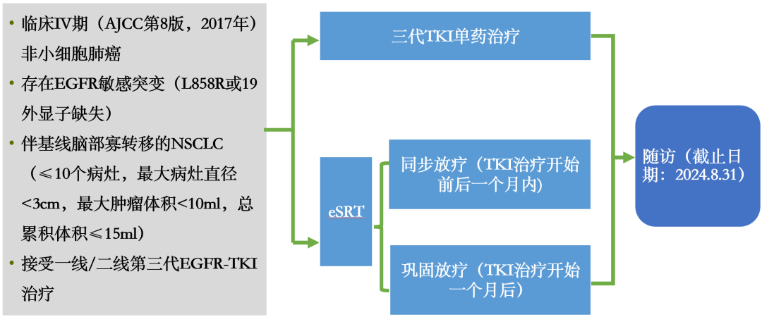 本研究主要的入组标准包括:接受第三代EGFR-TKI单药或联合eSRT治疗的EGFR突变NSCLC脑部寡转移患者。脑部寡转移的定义是:脑部转移病灶数量≤10个,最大病灶直径<3cm,最大肿瘤体积<10ml,总累积体积≤15ml。eSRT定义为在EGFR-TKI启动前1个月到首次疾病进展(PD)前实施的脑部SRT。根据eSRT与EGFR-TKI启动之间的间隔又分成两个亚组: