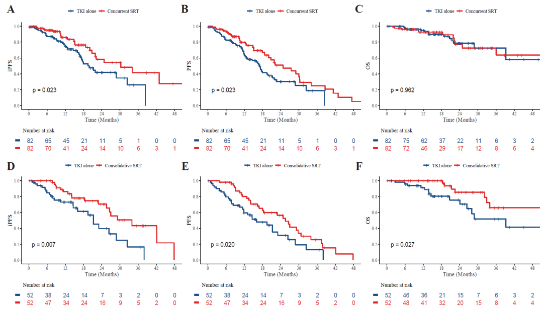 本研究共纳入400例患者,其中134例(33.5%)接受了eSRT(同步82例,巩固52例)。PSM匹配后,eSRT组的iPFS(30.3 vs.21.9个月,p=0.007)、PFS(26.6 vs.17.1个月,p=0.003)及OS(未达到vs.39.2个月,p=0.039)均显著优于单纯TKI组(均P<0.05)。