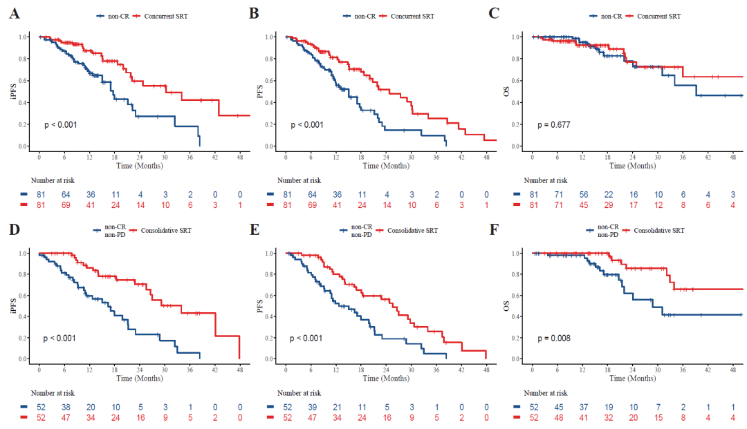 图4.未完全缓解(non-CR)患者:巩固SRT和同步SRT的iPFS,PFS和OS