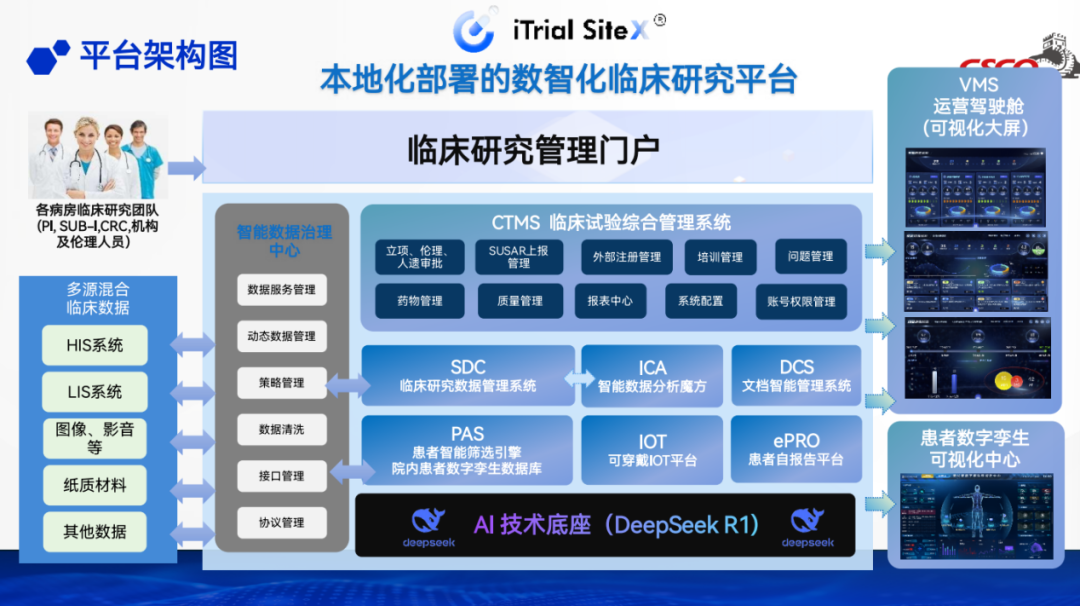 平台以DeepSeek R1为AI技术底座,提供核心技术支撑。搭配VMS运营驾驶舱(可视化大屏),直观呈现数据动态;结合“患者数字孪生可视化中心”,实现患者数据的可视化分析,助力临床研究高效决策与深度洞察。