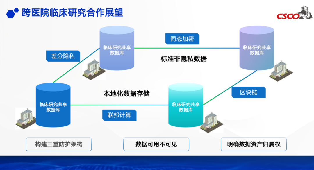 针对隐私保护与医学创新的矛盾制约,国外主要采用隐私增强技术(PETs)解决此问题,实现“数据可用不可见”,各机构数据在本地完成模型训练,仅共享分隐私和加密参数。某跨国脑肿瘤研究中,AI支持多家机构联合建模,在保护患者隐私的前提下,模型准确率达到国际先进水平。此外,行业内更需要制定隐私保护的相应规范,如《肿瘤临床研究隐私保护协议框架》,优化跨院数据共享审批流程;开发智能数据治理平台集成分类、加密、审计功能,DeepSeek等AI技术提供底层支持实现非结构化数据自动脱敏,构建起安全可控的数据共享环。