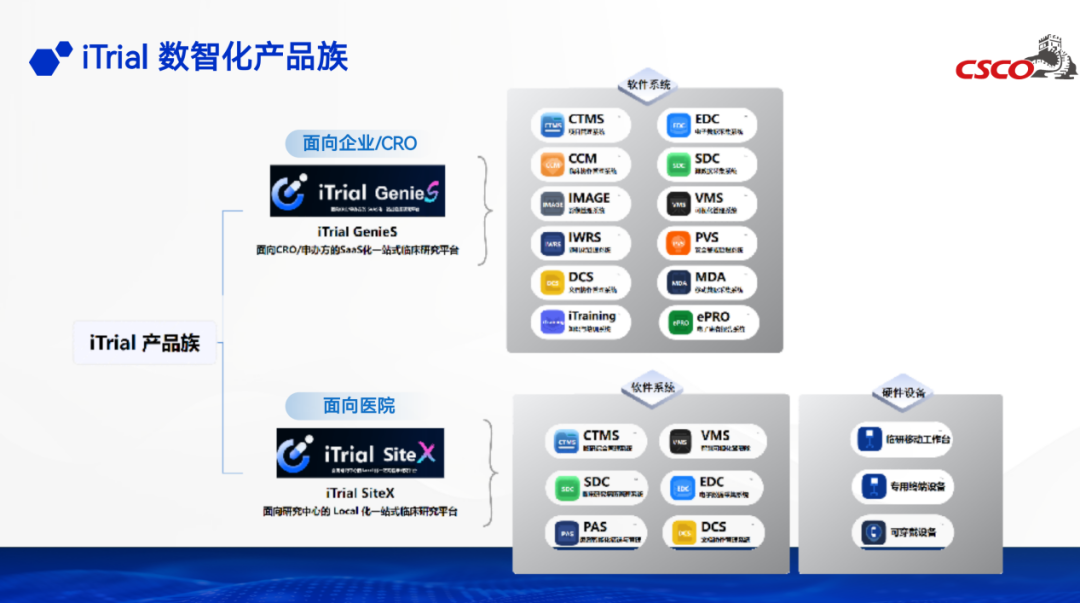 CTMS临床试验综合管理系统是平台关键基础模块,覆盖立项、伦理、人遗审批,SUSAR上报管理、外部注册管理、培训管理、问题管理等流程,同时包含药物管理、质量管理、报表中心、系统配置、账号权限管理等功能,实现临床试验全链条管理。平台还集成多个特色系统:SDC临床研究数据管理系统、ICA智能数据分析魔方、DCS文档智能管理系统,以及PAS患者智能筛选引擎(联动院内患者数字孪生数据库)、IOT可穿戴平台、ePRO患者自报告平台。各系统协同运作,覆盖数据管理、分析、文档处理及患者管理等环节。