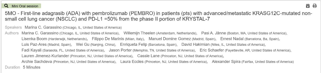 该研究中,符合入组标准的患者接受一线Adagrasib 400 mg,口服,每日两次联合帕博利珠单抗200 mg,静脉,每三周一次的治疗,主要研究终点为研究者评估的ORR,次要研究终点包括DOR、PFS、OS安全性。