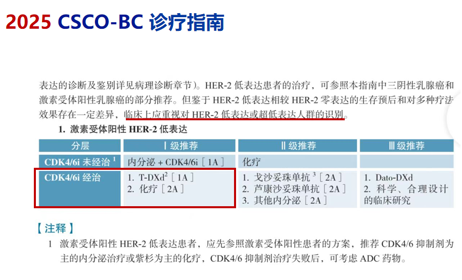 因此,从当前临床研究结果及《CSCO BC指南》更新情况来看,对于HER2低表达且激素受体阳性的患者,在CDK4/6抑制剂治疗失败后,一般推荐直接选择T-DXd治疗,也可选择化疗,但两者的证据级别不同。T-DXd治疗的证据级别为1A类,化疗为2A类,主要依据是DB-04和DB-06临床研究数据。