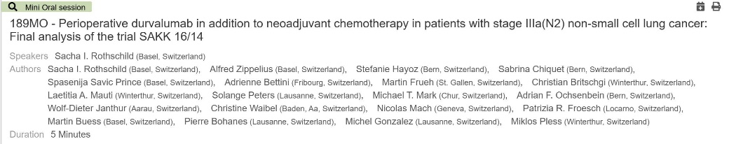 度伐单抗联合化疗新辅助治疗IIIa-N2非小细胞肺癌患者的疗效及安全性SAKK16/14研究最终数据分析