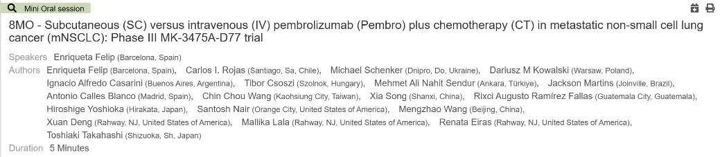 皮下或静脉帕博利珠单抗联合化疗在转移性非小细胞肺癌患者的疗效及安全性:III期MK-3475A-77D研究