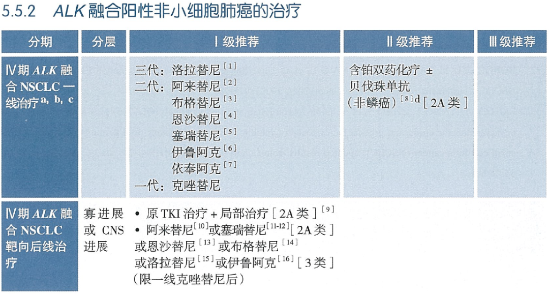 对于IV期ALK融合NSCLC一线治疗:Ⅰ级推荐包括伊鲁阿克在内的一、二、三代ALK-TKI,取消24年版中不同治疗策略的“优先”字样。