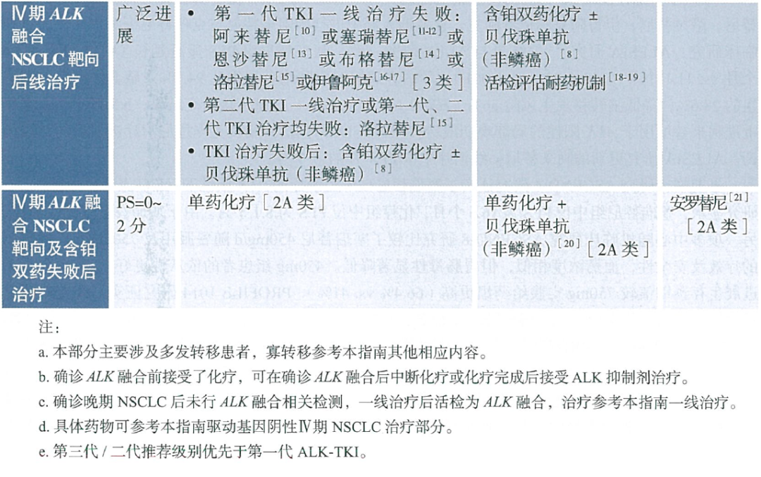 对于IV期ALK融合NSCLC靶向后线治疗:当广泛进展时,若为一代TKI一线治疗失败者,推荐伊鲁阿克(3类)。本条推荐更新了【注释】部分的循证医学证据。