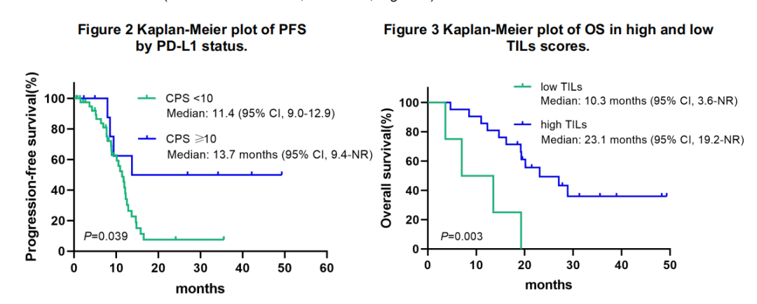 探索性分析表明,PD-L1 CPS≥10的患者PFS显著更长(13.7 vs.11.4个月,P=0.039)。肿瘤浸润淋巴细胞(TILs)高的患者OS显著更长(23.1 vs.10.3个月,P=0.003)。