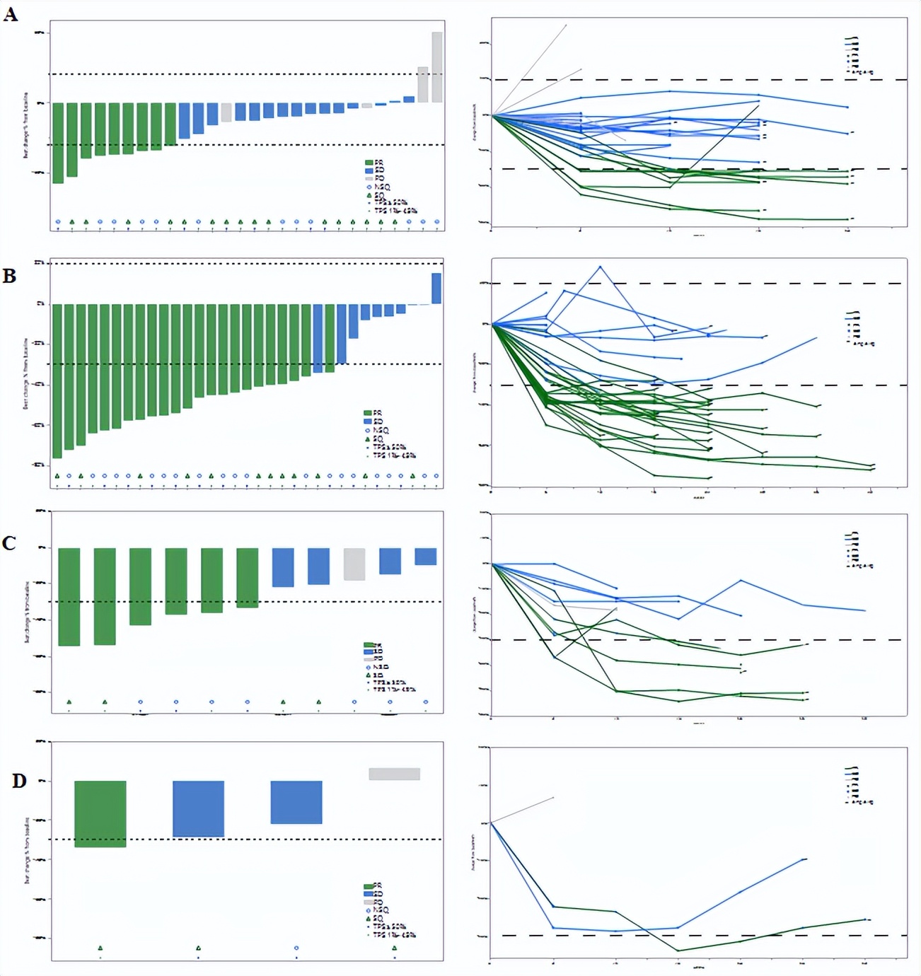 图2瀑布图和蜘蛛图。图2-A SSGJ-707 5mg/kg Q3W。图2-B SSGJ-707 10mg/kg Q3W。图2-C SSGJ-707 20mg/kg Q3W。图2-D SSGJ-707 30mg/kg Q3W。