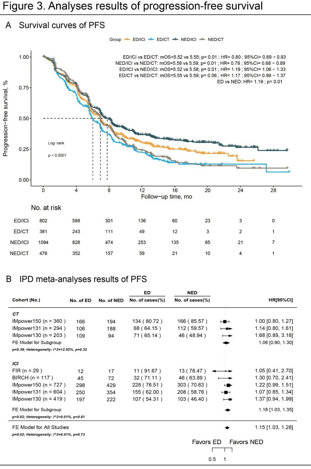 排除了无进展生存期不为主要结局的临床试验,并在初治临床试验中进一步研究了情绪困扰与无进展生存期的关系。Kaplan-Meier分析表明,不论免疫检查点抑制剂(中位PFS分别为5.52个月与5.58个月;p=0.01;HR=1.19[1.06-1.33])还是化疗(中位PFS分别为5.55个月与5.59个月;p=0.06;HR=1.17[0.99-1.37]),情绪困扰患者的无进展生存期较差。IPD荟萃分析也支持了上述结果(HR=1.15[1.03-1.28],p=0.02)。