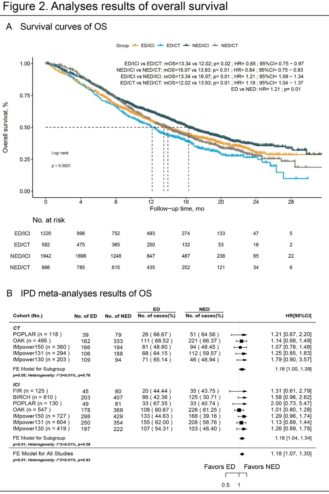 在4632名参与者中,2753名(59.43%)接受了初治治疗;3162名(68.26%)接受了免疫检查点抑制剂治疗;1802名(38.90%)被归类为情绪困扰组,2830名(61.10%)为非情绪困扰组。Kaplan-Meier分析表明,不论接受免疫检查点抑制剂还是化疗(CT),情绪困扰患者的生存结局均较差(HR_OS=1.21,p=0.01;HR_PFS=1.19,p=0.01)。与非情绪困扰组相比,情绪困扰患者在免疫检查点抑制剂治疗组(情绪困扰组与非情绪困扰组,中位OS分别为13.34个月与16.07个月;p=0.01;HR=1.21[1.09-1.34])和化疗组(中位OS分别为12.02个月与13.93个月;p=0.01;HR=1.19[1.04-1.37])均表现出较差的生存期。IPD荟萃分析显示,情绪困扰组的总生存期较差(HR=1.18[1.07-1.30],p=0.01)。亚组分析在免疫检查点抑制剂组(HR=1.18[1.04-1.34],p=0.01)和化疗组(HR=1.18[1.00-1.39],p=0.05)均确认了这一关联。