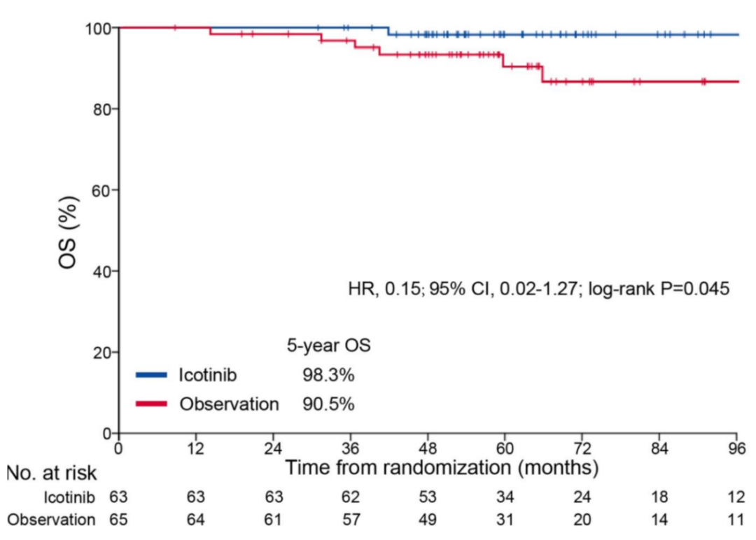 中位随访65.0个月显示,埃克替尼组vs观察组的5年DFS率为88.5%vs 67.7%,(log-rank P=0.012,HR=0.38;95%CI:0.18-0.83),埃克替尼降低了62%的疾病进展或死亡风险,首次证实了第一代EGFR-TKI在IB期NSCLC患者中的长期获益。
