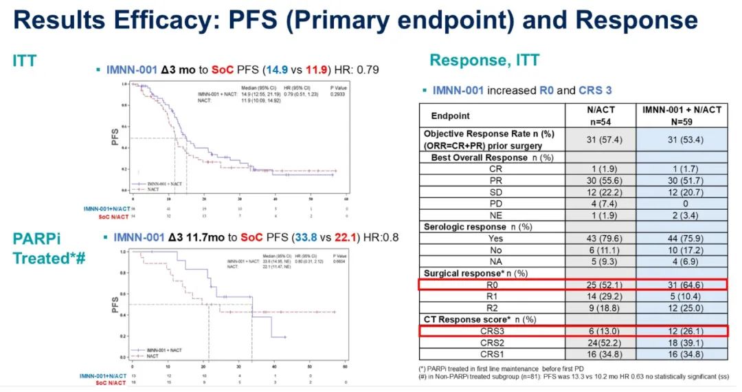 Thaker教授:感谢您的提问。关键的区别在于,OVATION-2试验采用的免疫疗法是腹腔注射,即直接将药物注射至肿瘤所在的区域。我们确实观察到了肿瘤微环境的局部变化:在一部分患者中,我们得以在任何抗癌治疗之前进行活检取样,然后将其与间歇性肿瘤细胞减灭术(IDS)时获取的样本进行对比(因为这些患者接受了新辅助治疗)。我们可以观察到,在免疫标志物层面,肿瘤免疫环境发生了变化。我们知道,IL-12免疫疗法同时作用于先天性免疫和适应性免疫,这一点非常关键,而免疫检查点抑制剂则更侧重于T细胞。IMNN-001(IL-12)是一种非常强效的细胞因子,IL-12免疫疗法可以通过多种途径作用于免疫系统。