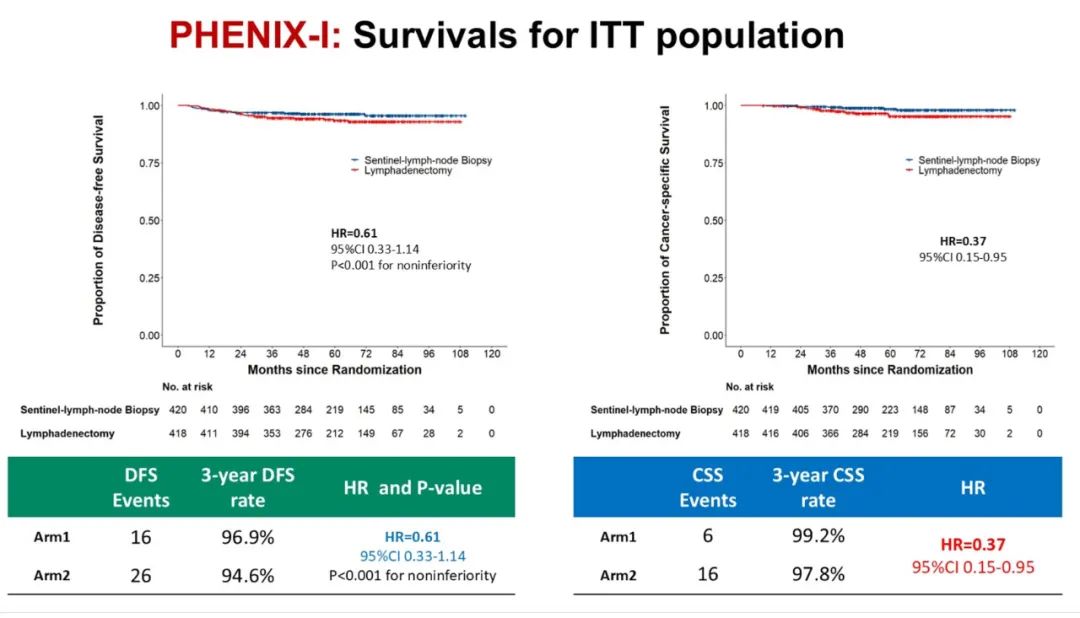 针对前哨淋巴结阴性患者的PHENIX-I试验纳入了838名患者,随机分配至前哨淋巴结活检组和淋巴结清扫术组。两个组之间的唯一区别在于:实验组患者在前哨淋巴结活检后,不再进行系统性淋巴结清扫术。PHENIX-I研究旨在检验一个主要假设:无病生存期(DFS)具有非劣效性。这项研究达到了主要终点。前哨淋巴结活检组的3年DFS率不劣于淋巴结清扫组。