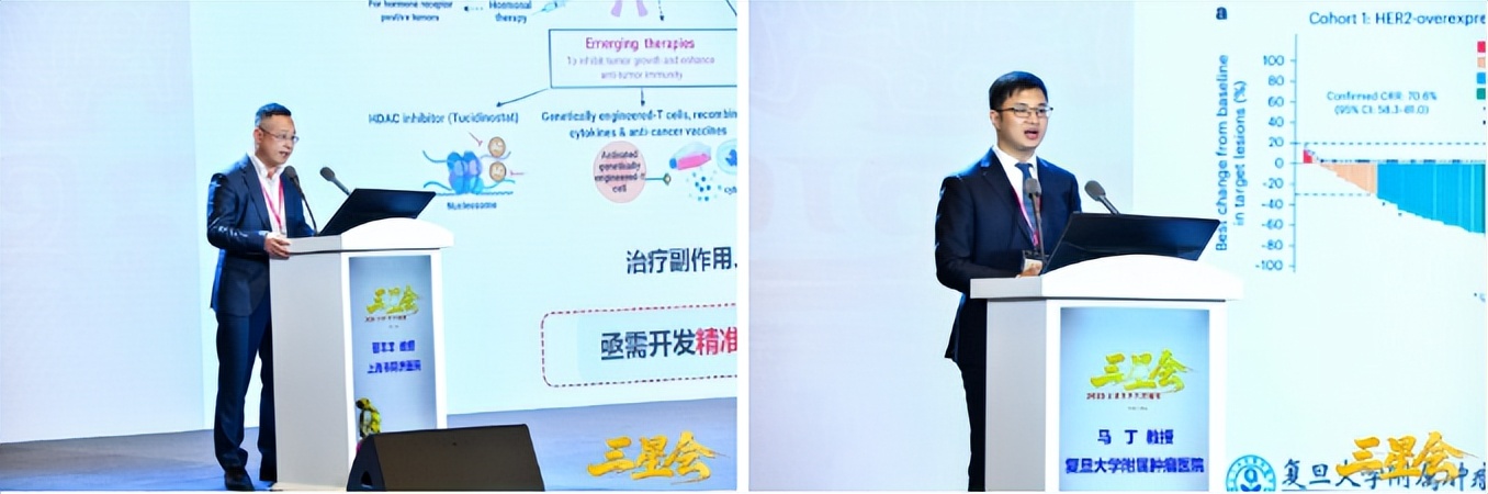 在“清梦压星河——青年新见解新势力新观点”环节,上海市同济医院蔡丰丰教授介绍了“智能诊疗器在乳腺癌精准治疗中的应用”,展示了合成生物学在乳腺癌治疗中的创新应用前景。复旦大学附属肿瘤医院马丁教授则分享了“新一代抗HER2 ADC药物新辅助治疗队列转化研究”,通过空间组学技术揭示了新一代ADC药物的疗效预测标志物,为乳腺癌精准治疗提供了新的科学依据。