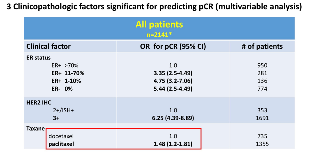 研究还发现与高pCR率相关的因素,包括:ER≤70%(包括ER 0表达)、HER2 IHC 3+(相较于IHC 2+/ISH+)、紫杉周疗(相较于多西他赛q3w)等临床病理特征,以及HER2DX高评分的患者具有更好的pCR率;而临床分期(包括肿瘤大小T和淋巴结N)与pCR率没有显著相关性。